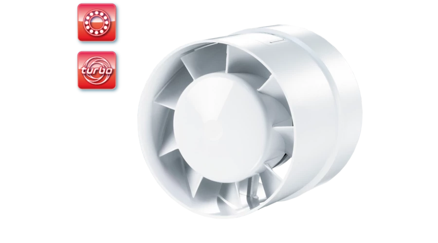 UV-álló ABS műanyagból készült, fürdőszoba, zuhanyzó, konyha és egyéb használati helyiség folyamatos vagy időszakos elszívására. Háztartási csőventilátor, 100 mm légcsatornához. Golyóscsapágyas, emelt légszállítású motorral szerelt kivitel.