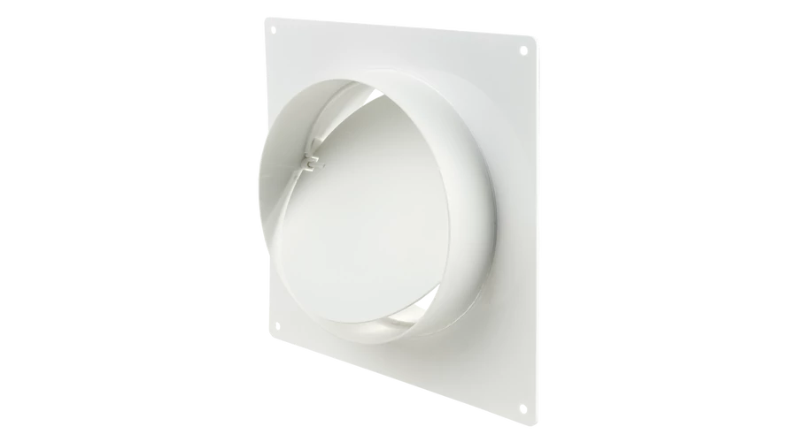 Fehér PVC-ből készült, befúváshoz és elszíváshoz használt légtechnikai elem. Műanyag keretes csőtoldó visszacsapószeleppel, fali takarólappal 100 mm kör légcsatornához, 150 mm külmérettel.