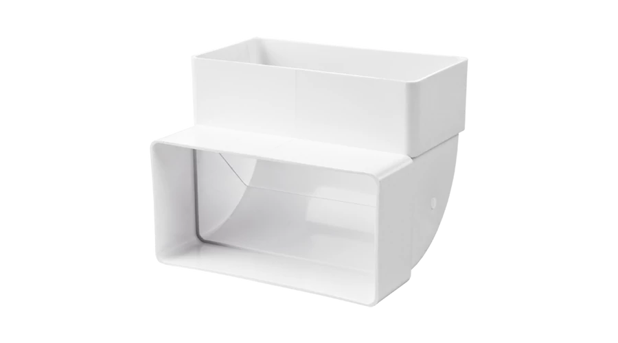 Fehér PVC-ből készült, befúváshoz és elszíváshoz használt légtechnikai elem. Műanyag négyszög könyökidom, vertikális, 55*110 mm keresztmetszethez, 90 fok.