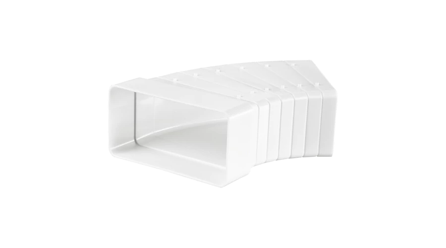 Fehér PVC-ből készült, befúváshoz és elszíváshoz használt légtechnikai elem. Műanyag négyszög könyökidom, horizontális, 60*204 mm keresztmetszethez, 45 fok.