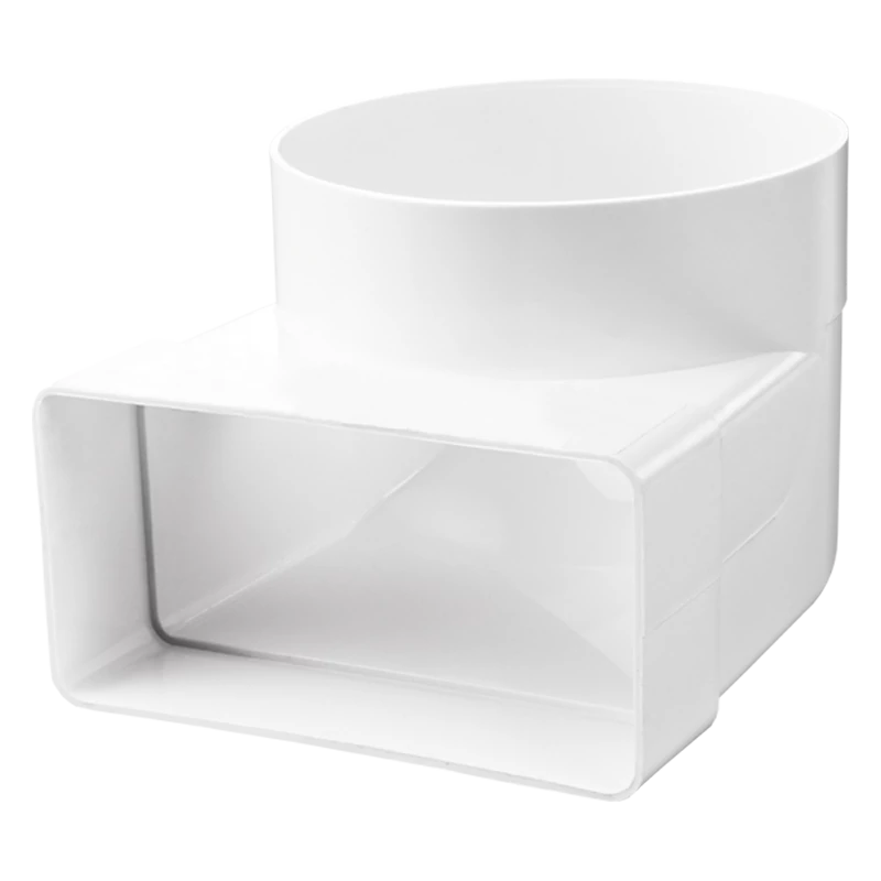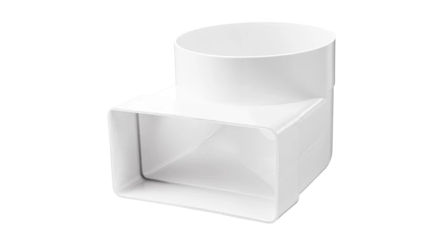 Fehér PVC-ből készült, befúváshoz és elszíváshoz használt légtechnikai elem. Műanyag átalakító idom, könyök, rövid csonkú, idomcsatlakozós, 90*220 mm átmérő, 150 mm keresztmetszet.