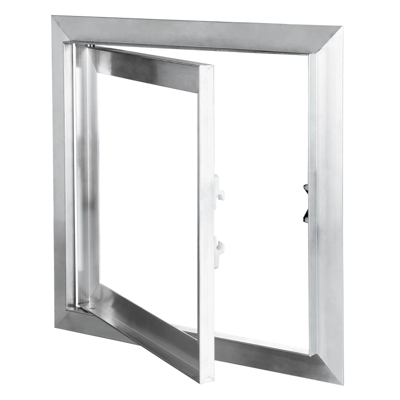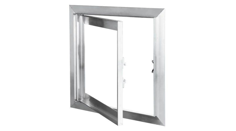 Alumíniumból készült ellenőrzőablak, gipszkarton falakhoz. Alkalmas magas páratartalmú helyiségekhez. Bal vagy jobb oldali nyitás. 400x400 mm.