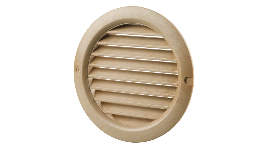 Műanyag takaróelem lakossági, közületi vagy ipari szellőzőrendszerek be- és elszívónyílásainak lezárására. Világos faerezet minta, kerek kialakítás. Szúnyoghálóval. 100mm átmérő csőcsatlakozás.