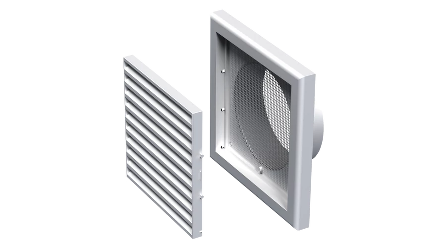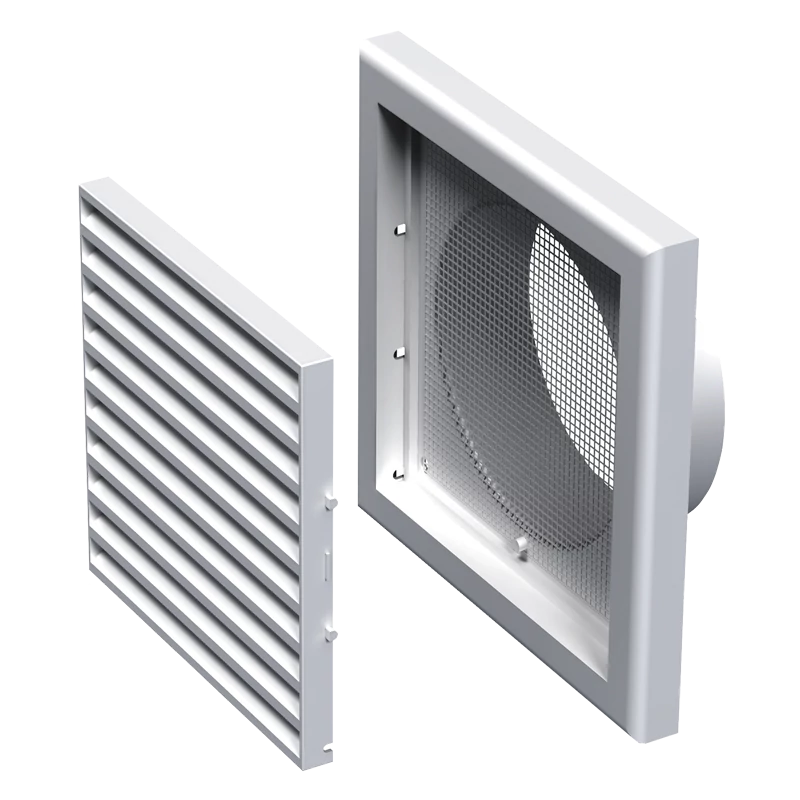Műanyag takaróelem lakossági, közületi vagy ipari szellőzőrendszerek be- és elszívónyílásainak lezárására. Fehér szín, négyszögletes kialakítás. Szúnyoghálóval. Vízszintes rácsozással. 125 mm átmérő csőcsatlakozás. 187x187 mm.