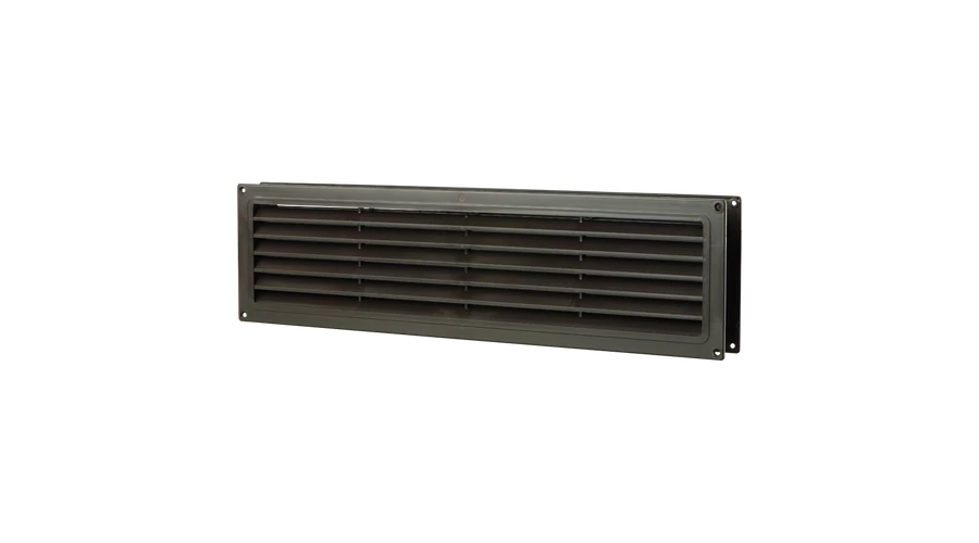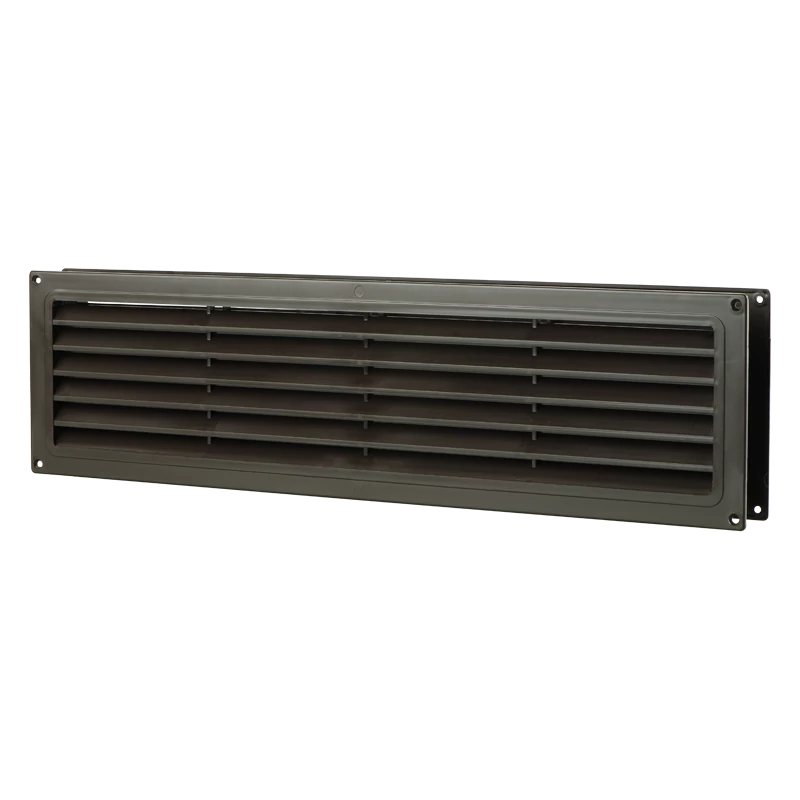Műanyag takaróelem lakossági, közületi vagy ipari szellőzőrendszerek be- és elszívónyílásainak lezárására. Barna szín, négyszögletes kialakítás. Szabályozható zsaluval. Csőcsatlakozás nélkül. 462x124 mm.