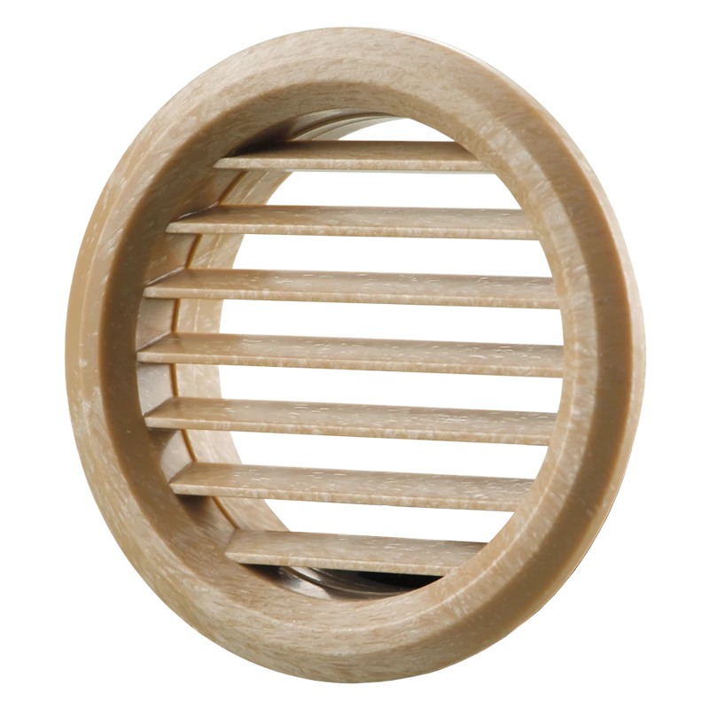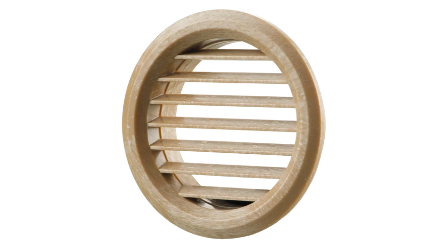 Műanyag takaróelem lakossági, közületi vagy ipari szellőzőrendszerek be- és elszívónyílásainak lezárására. Világos faerezet minta, kerek kialakítás. Szúnyoghálóval. 50 mm átmérő csőcsatlakozás. Párban csomagolva.