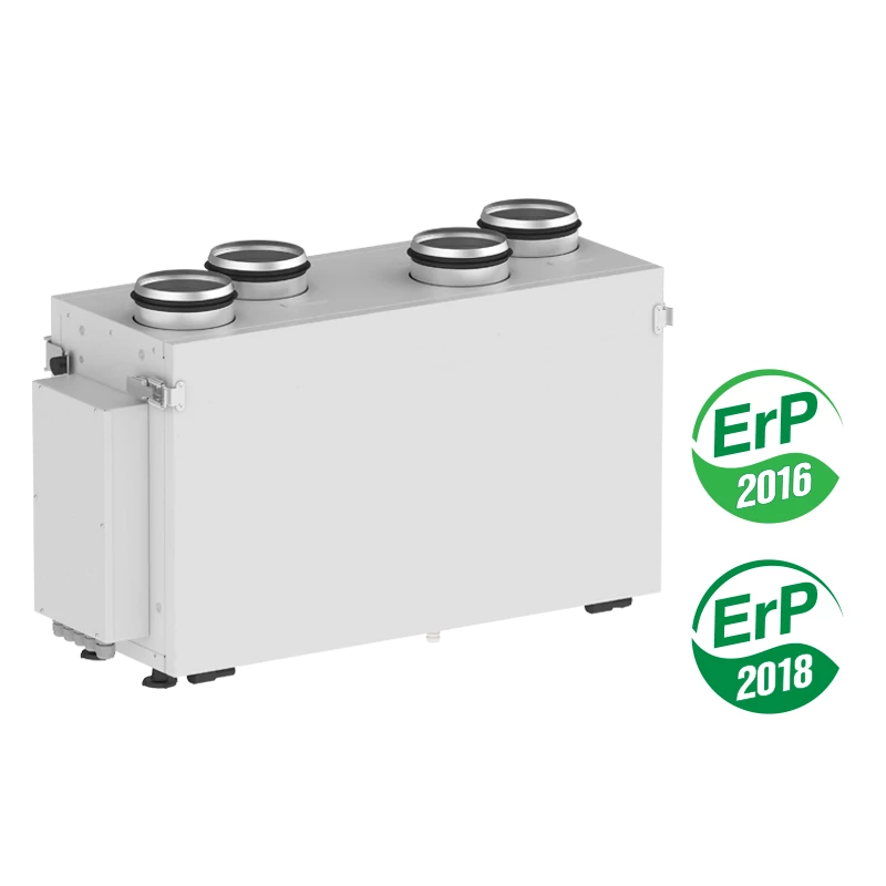 Hővisszanyerős légkezelő berendezés az energiahatékony szellőztetés kialakításához lakásokban, családi házakban, irodákban és egyéb helyiségekben. Hő és akár páravisszanyeréssel csökkenthetjük az energiafelhasználást és növelhetjük a komfortot a belső terekben. Vezérléssel testreszabható és igény szerint szabályozható a szellőzés az épületben. Légkezelő berendezés álló vagy oldalfali beépítés, EC motor, vertikális 125 mm-es csonkokkal, keresztáramú hővisszanyerővel, 250 m3/h 100 Pa teljesítménnyel, A14 vezérléssel.